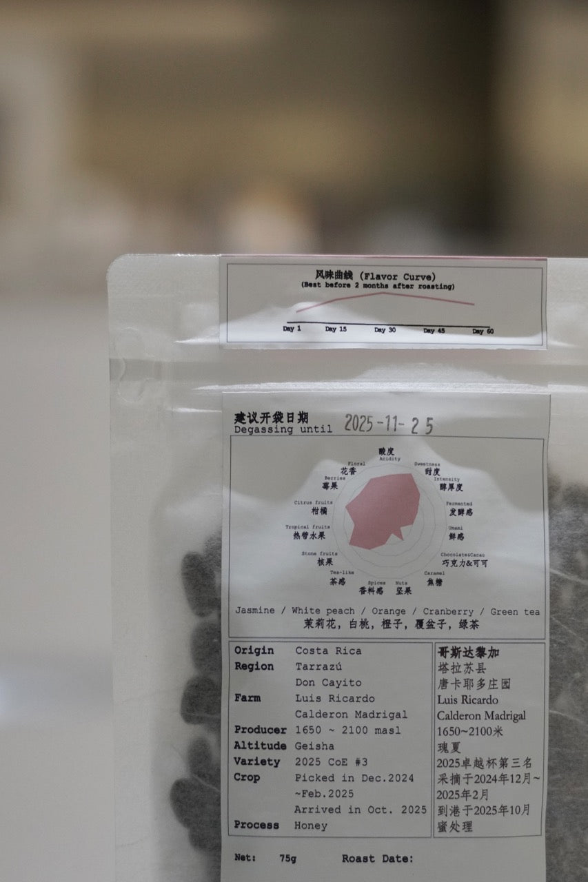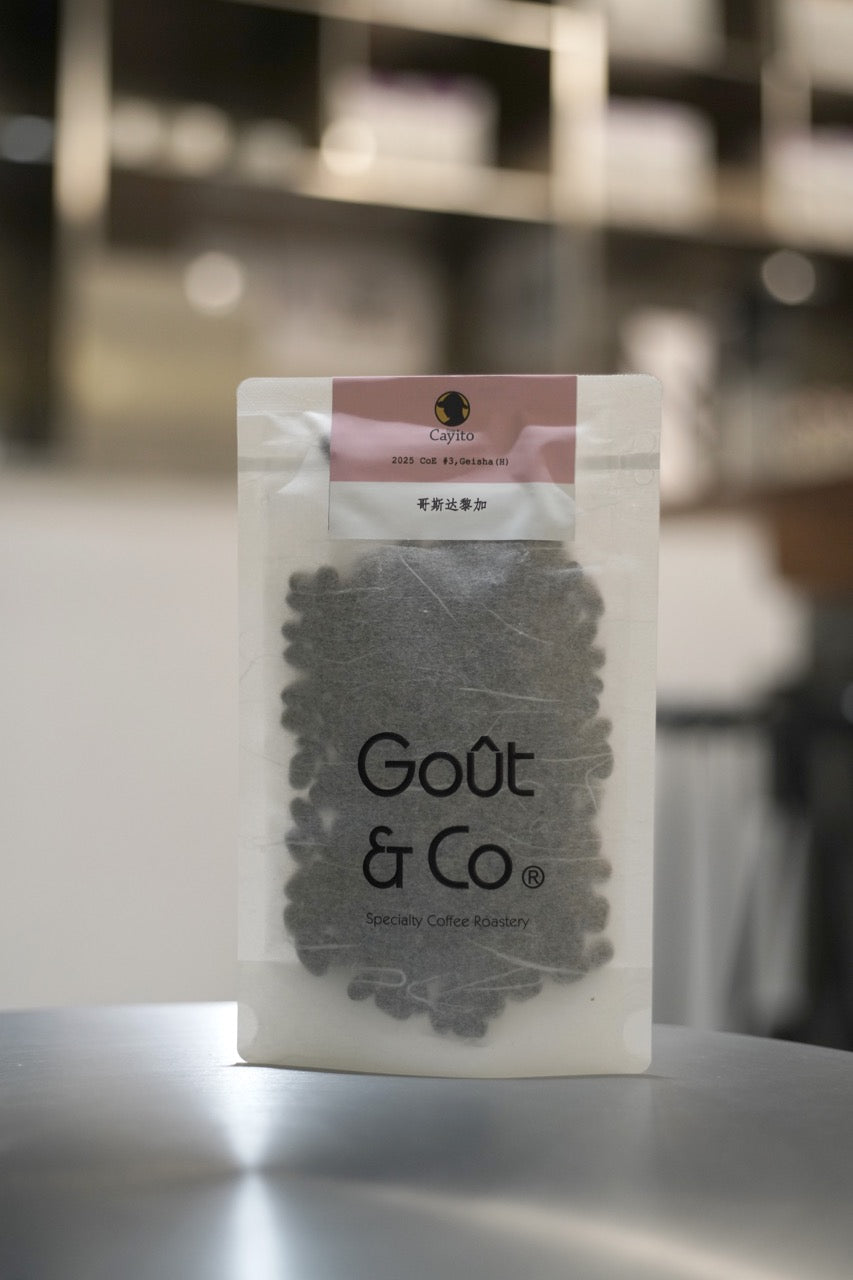 Origin: Costa Rica Region: Santa Maria de Dota,Tarrazú Farm: Don Cayito Producer: Luis Ricardo Calderon Madrigal Altitude: 1650 ~ 2100 masl Variety: Geisha Crop: Picked in Dec.2024~Feb.2025 /Arrived in Oct. 2025 Process: Honey |