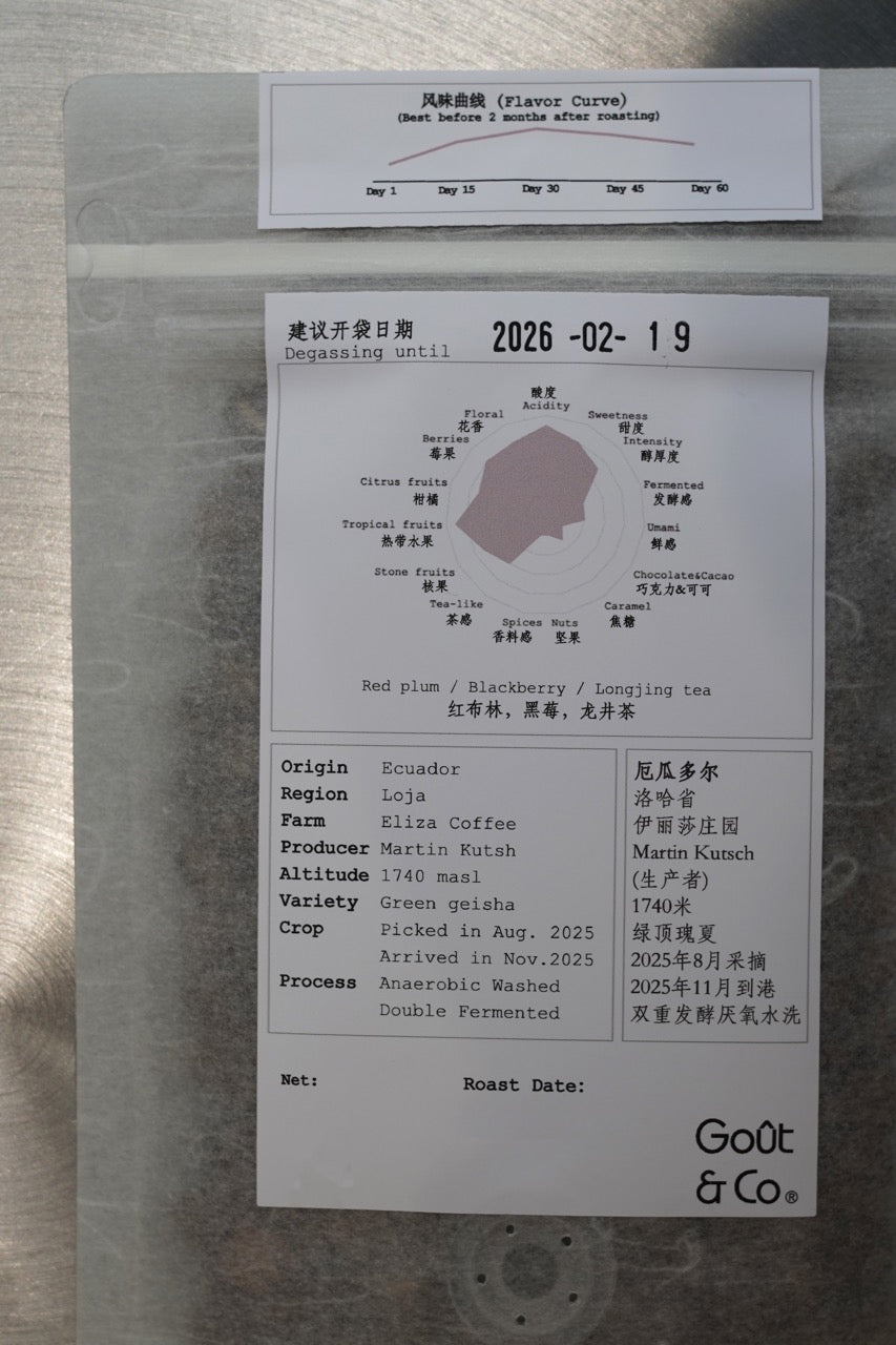 Origin: Ecuador Region: Loja Farm: Eliza Producer: Martin Kutsh Altitude: 1740 masl Variety: Green Tip Geisha Crop: Picked in Aug.2025 / Arrived in Nov.2025 Process: Anaerobic Washed Double Fermented |